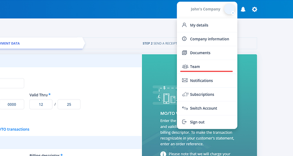 Trin 1: Begynd med at logge ind på din myPOS-konto Det næste skridt er at klikke på dit firmanavn/logo i øverste højre hjørne og vælge “Team” i dropdown-menuen.
