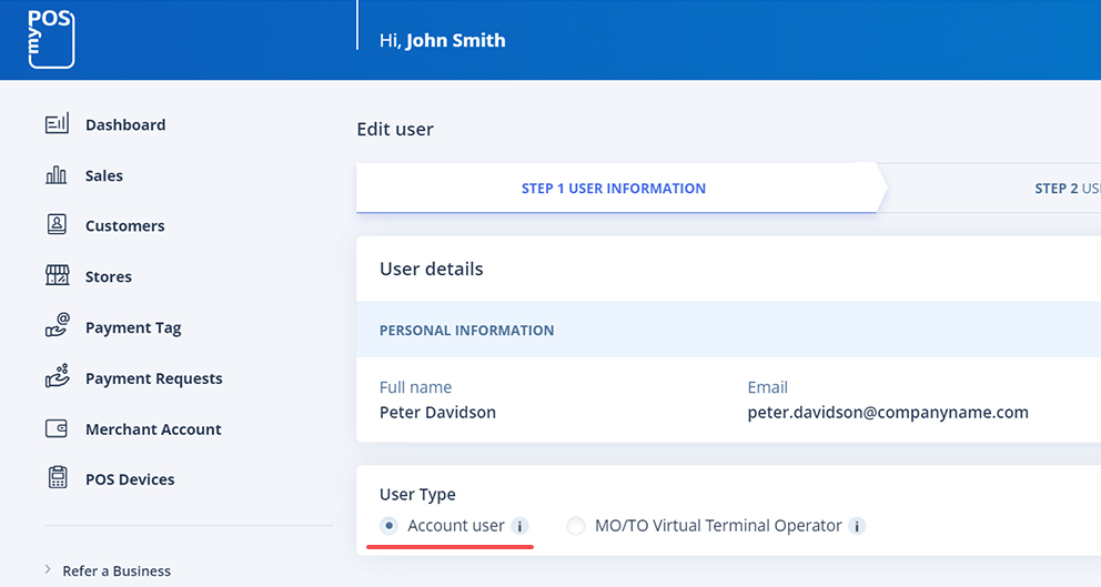 Trin 2: Du vil blive ført til en anden menu, hvor du kan redigere den nye brugers adgang eller tilføje en ny bruger til kontoen, hvis det er nødvendigt. Brugerrettighederne til at acceptere virtuelle Mo/To-betalinger kan findes under “Trin 2: Brugerrettigheder”.