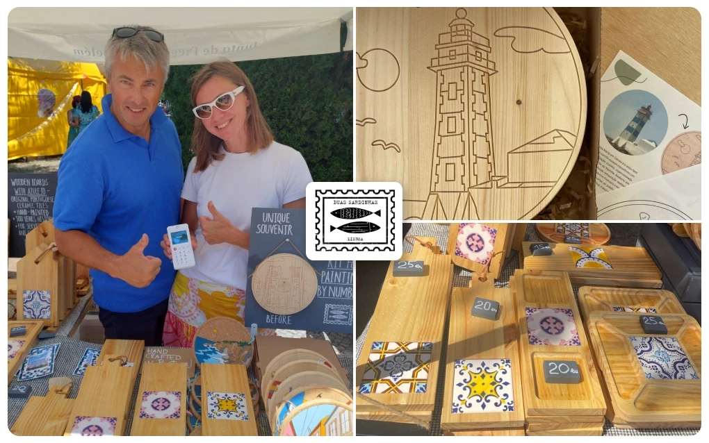 About a year ago, Duas Sardinhas embarked on a mission to introduce innovative souvenirs to the Portuguese market. They started with paint-by-numbers kits featuring Lisbon landmarks on wooden panels and later added serving boards and plates made from pinewood with original azulejo tiles, promoting traditional Portuguese art.