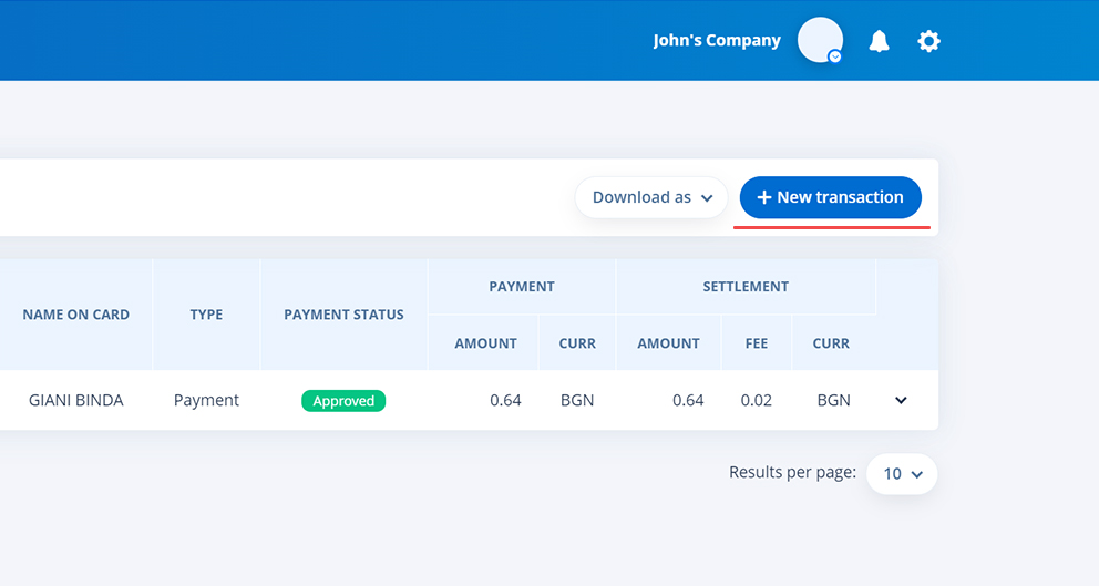 1 veiksmas: Eikite į savo „myPOS“ interneto paskyrą, spustelėkite „POS terminalai“ ir pasirinkite „MO/TO Virtualus terminalas“. Kai atsidarys naujas meniu, spustelėkite „+ Nauja tranzakcija“ – tai bus rodoma viršutiniame dešiniajame ekrano kampe.